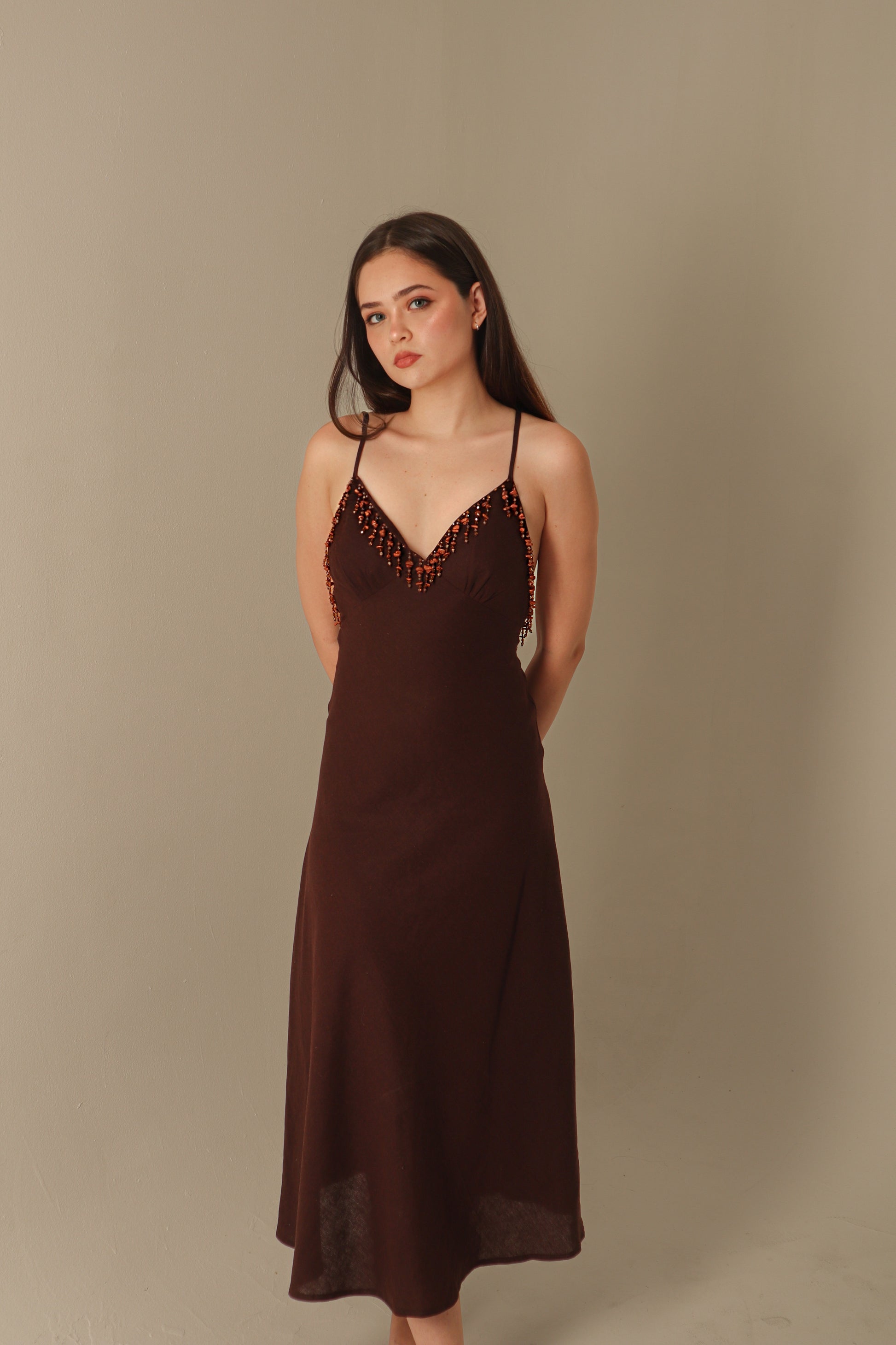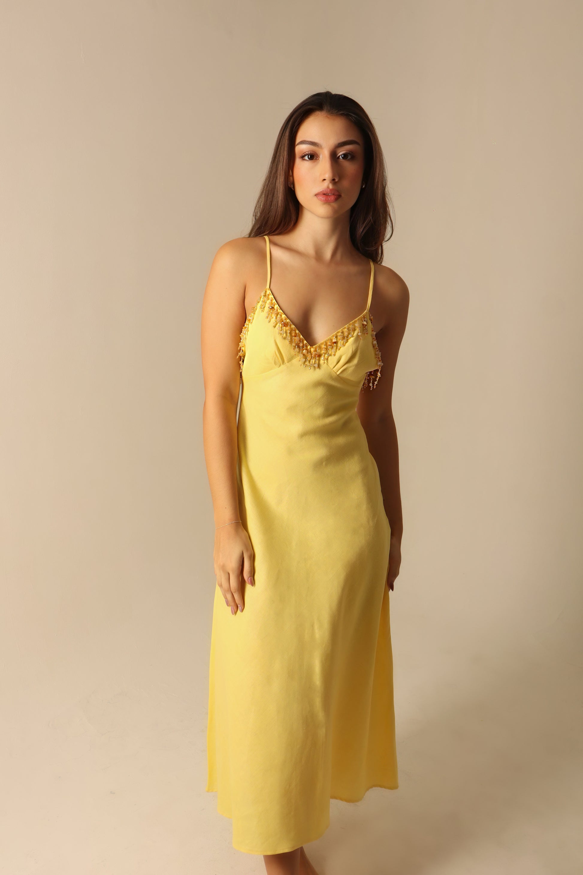 Vestido midi en lino color blanco con delicados tirantes ajustables y escote en V. El diseño se destaca por su bordado elegante a lo largo de todo el vestido.