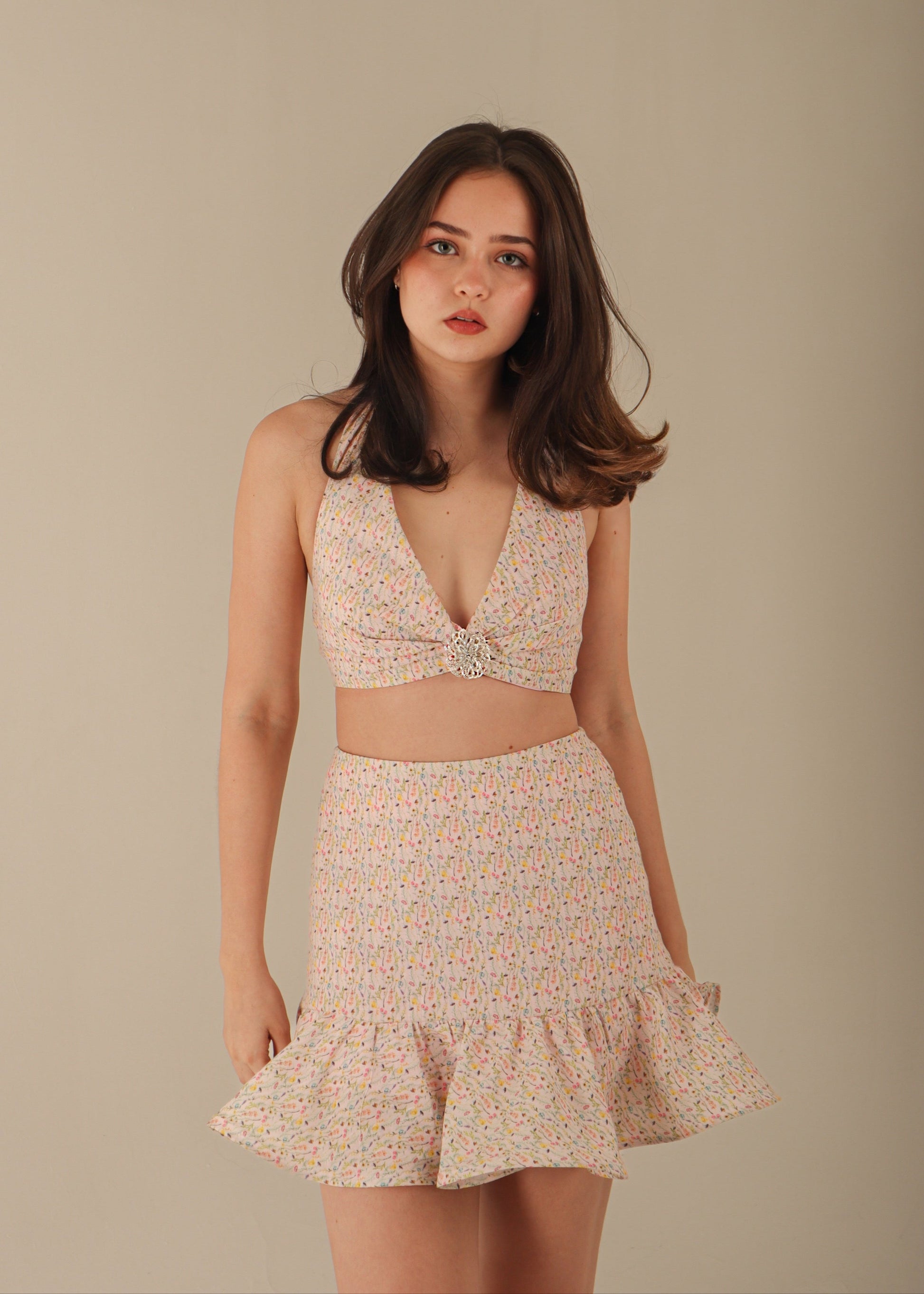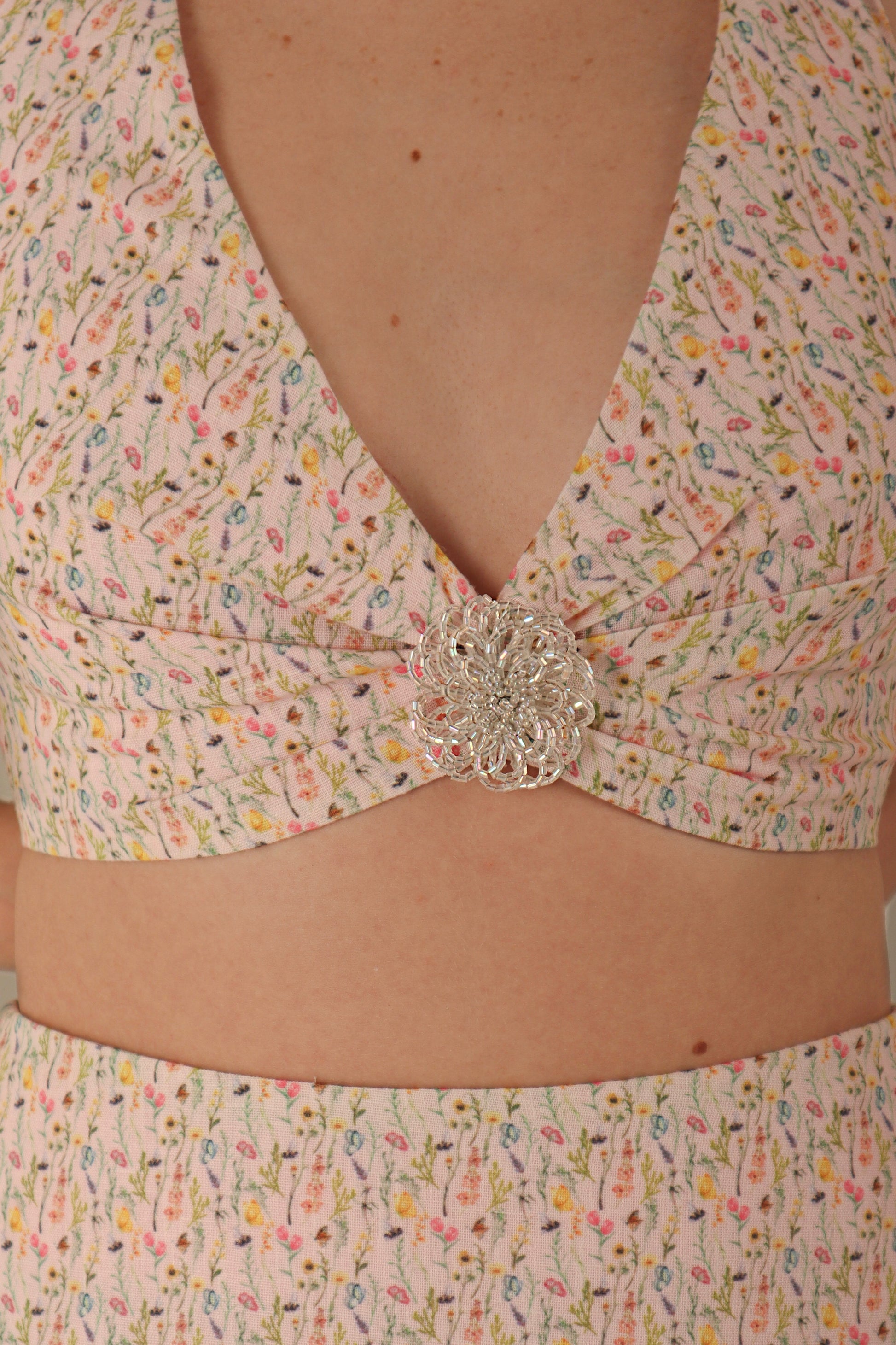Set en lino con estampado floral. Incluye top halter con espalda descubierta y falda con vuelo en el ruedo. El top se encuentra adornado con una flor en piedras bordada a mano en la parte frontal.