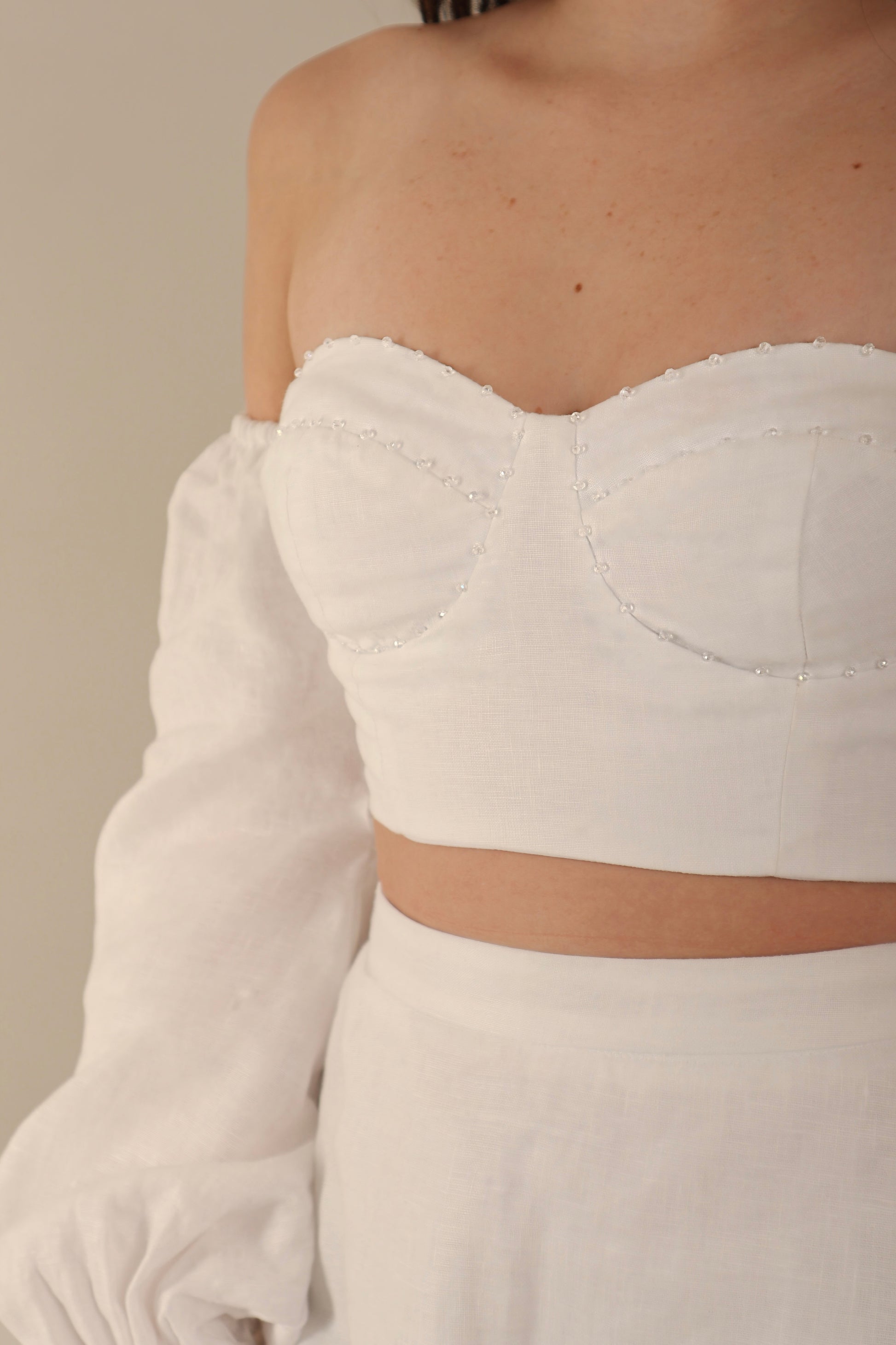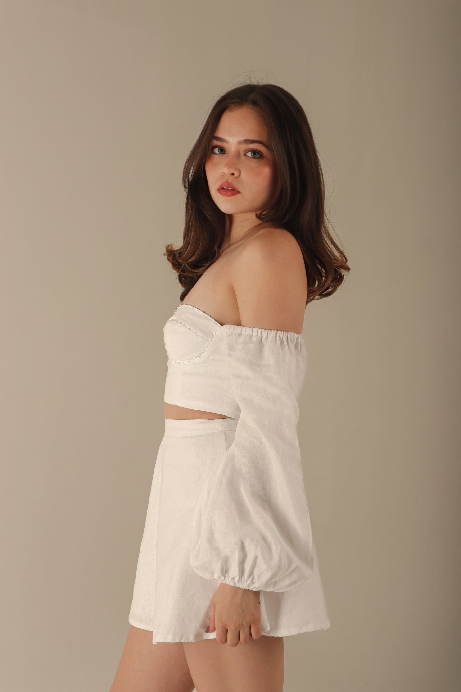 Set de dos piezas confeccionado en lino. El top presenta un diseño off-shoulder con mangas largas abullonadas, adornado con piedras en la parte frontal. Incluye una falda corta con corte en A, también decorada con delicados detalles de piedras.