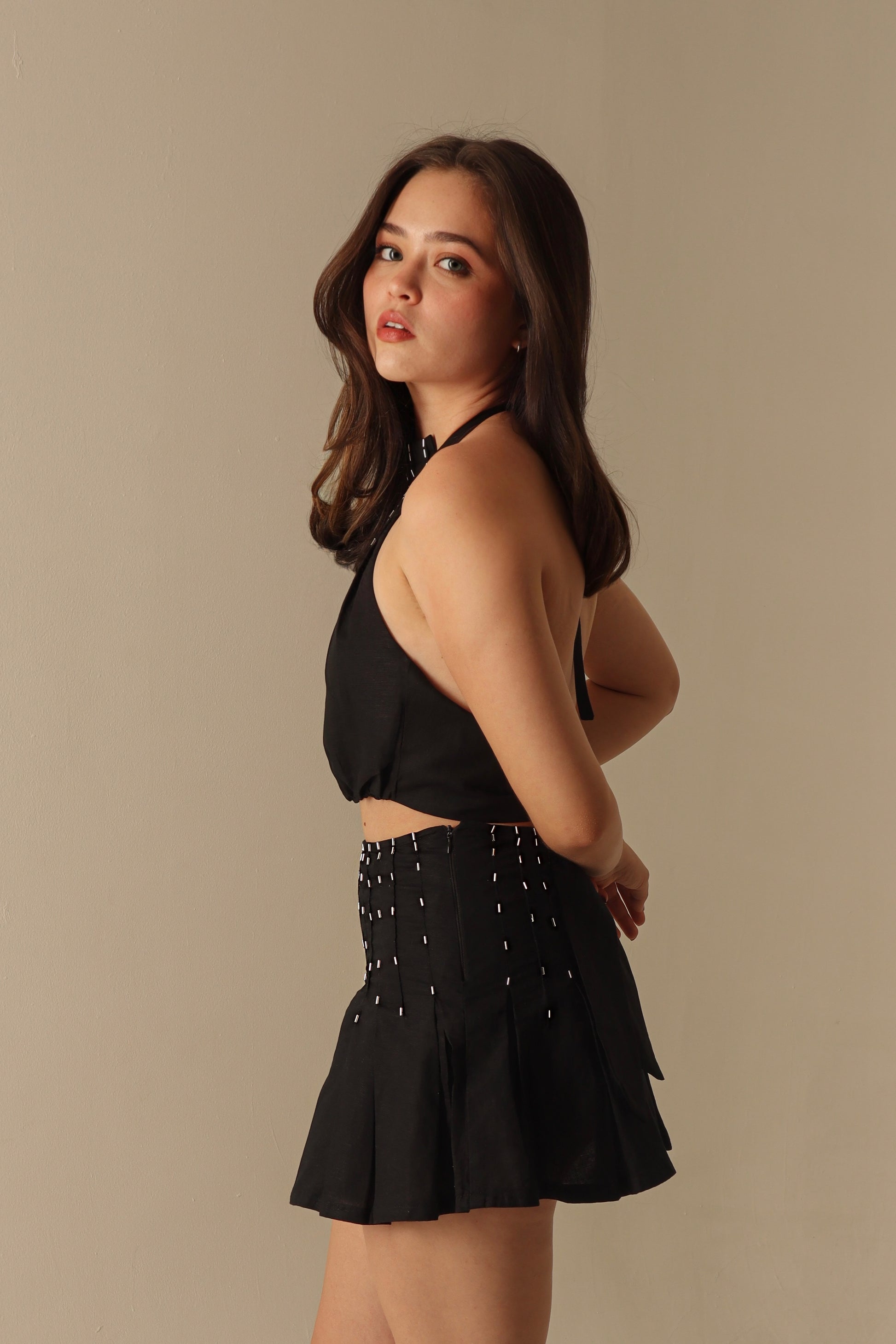 Set en lino con top que presenta escote halter con hombros y espalda descubiertos, y está bordado a mano con piedras en la parte frontal. La falda en lino con tablones está bordada con piedras en la parte frontal y posterior.